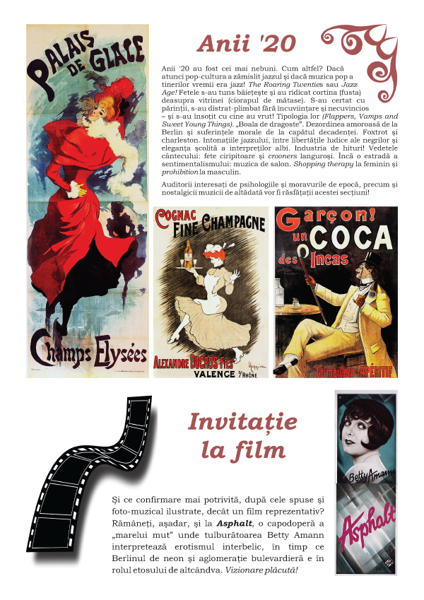 Anii '20 au fost cei mai nebuni. Cum altfel? daca atunci pop-cultura a zamislit jazzul si daca muzica pop a tinerilor vremii era jazz! The Roaring Twenties sau Jazz Age! Fetele s-au tuns baieteste si au ridicat cortina (fusta) deasupra vitrinei (ciorapul de matase). S-au certat cu parintii, s-au distrat-plimbat fara incuviintare si necuvincios – si s-au insotit cu cine au vrut! Tipologia lor (Flappers, Vamps and Sweet Young Things). "Boala de dragoste". Dezordinea amoroasa de la Berlin si suferintele morale de la capatul decadentei. Foxtrot si charleston. Intonatiile jazzului, intre libertatile ludice ale negrilor si eleganta scolita a interpretilor albi. Industria de hituri! Vedetele cantecului: fete ciripitoare si crooners langurosi. Inca o estrada a sentimentalismului: muzica de salon. Shopping therapy la feminin si prohibition la masculin.
