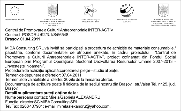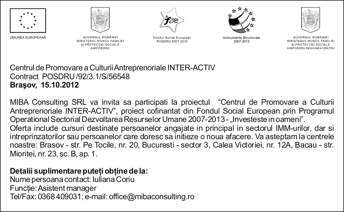 For detailed information regarding other European Union funded projects, we invite you to visit www.fonduri-ue.ro The content of this material does not necessarily represent the official position of the European Union or Romania’s Government |