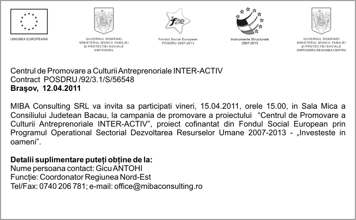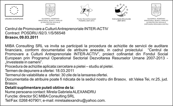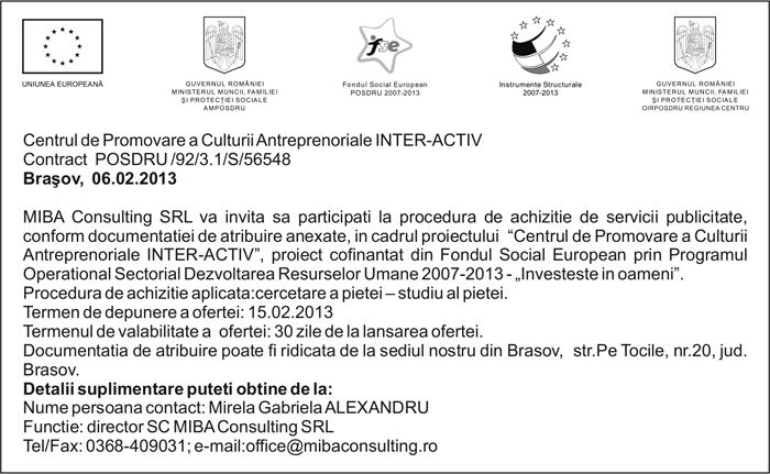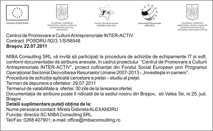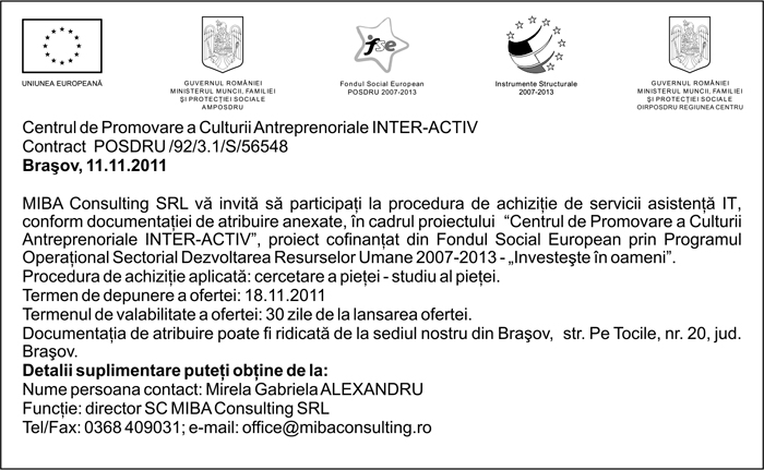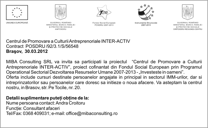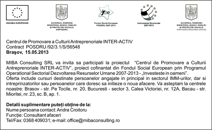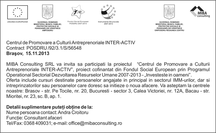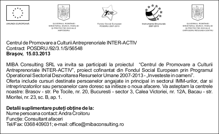 Pentru informatii detaliate despre celelalte programe cofinantate de Uniunea Europeana, va invitam sa vizitati www.fonduri-ue.ro Continutul acestui material nu reprezinta in mod obligatoriu pozitia oficiala a Uniunii Europene sau a Guvernului Romaniei. |