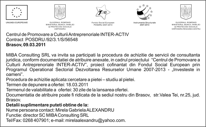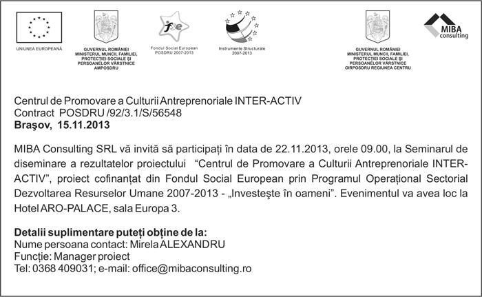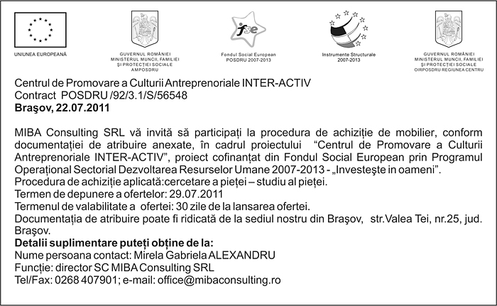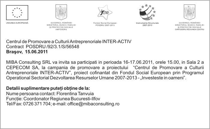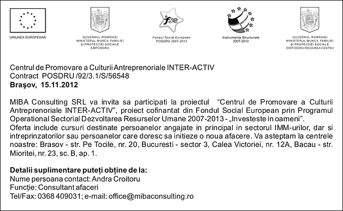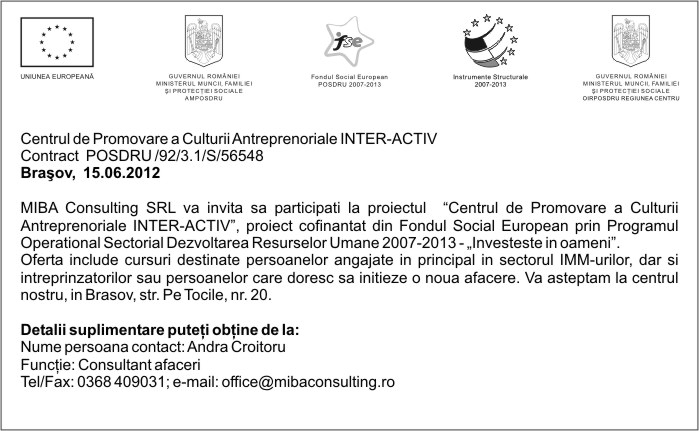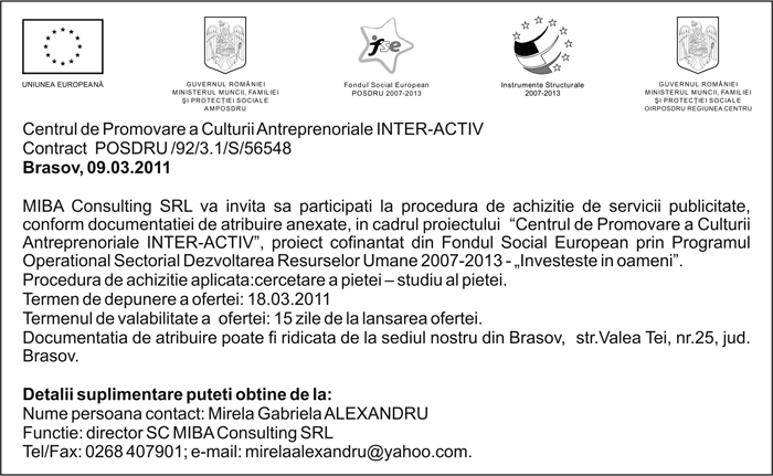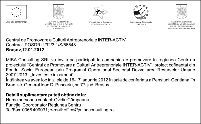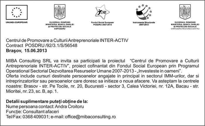 Pentru informatii detaliate despre celelalte programe cofinantate de Uniunea Europeana, va invitam sa vizitati www.fonduri-ue.ro Continutul acestui material nu reprezinta in mod obligatoriu pozitia oficiala a Uniunii Europene sau a Guvernului Romaniei. |